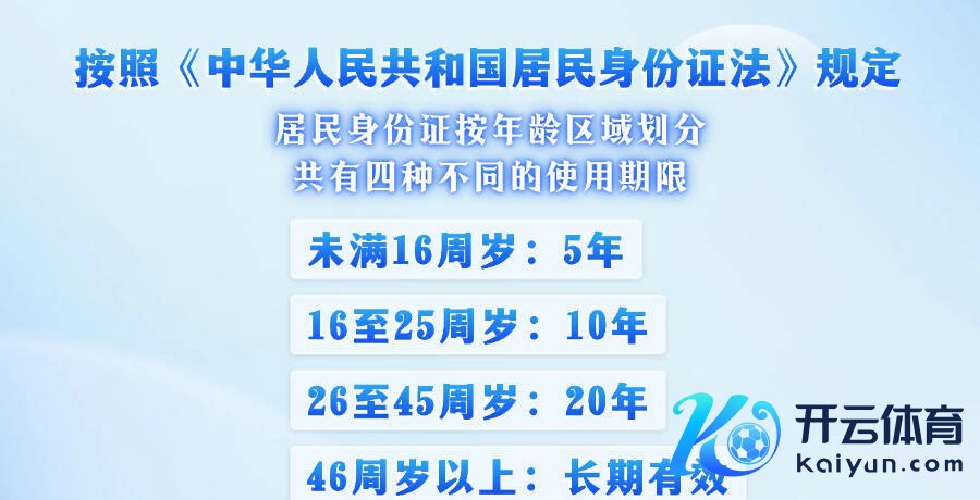 答:《中华东谈主民共和国居民身份证法》第五条治安,十六周岁以上公民的居民身份证的灵验期为十年、二十年、永恒。十六周岁至二十五周岁的,发给灵验期十年的居民身份证;二十六周岁至四十五周岁的,发给灵验期二十年的居民身份证;四十六周岁以上的,发给永恒灵验的居民身份证。未满十六周岁的公民,自发肯求领取居民身份证的,发给灵验期五年的居民身份证。