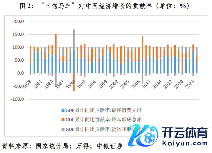 从对经济增长的孝敬率看,2020~2024年,浮滥孝敬率平均为47.0%,较2015~2019年低了16.5个百分点;投资平均为36.6%,卓越1.2个百分点;净出口平均为16.4%,卓越15.3个百分点。其中,2024年,浮滥对经济增长的孝敬率仅为44.5%,较2023年的85.6%大幅回落,以致低于2020~2023年均值47.7%的水平,为2008年全球金融危险以来次低(仅高于2020年的-4.3%)(见图2)。
