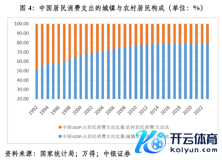 从住户浮滥支拨的组成看,城镇住户浮滥悔怨是现时最终浮滥需求不足的主要原因。2020~2023年,城镇住户浮滥支拨占比算术平均值为79.0%,较2015~2019年均值低了0.1个百分点;农村住户浮滥支拨占比平均为21.0%,卓越0.1个百分点(见图4)。