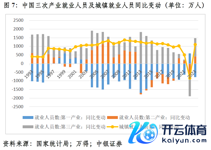 城镇住户收入增长放缓与疫情时代战役性、纠合性服务业受到较大冲击联系。2020~2023年,中国第一产业服务东谈主员算术平均每年减少443万东谈主,较2015~2019年均值少减302万东谈主;第二产业服务东谈主员年均加多72万东谈主,多增436万东谈主;第三产业服务东谈主员年均加多20万东谈主,少增909万东谈主(见图7)。同期,城镇服务东谈主员年均加多446万东谈主,较2015~2019年均值少增606万东谈主;城镇住户东谈主均可足下收入中,工资性收入占比的算术平均值为60.2%,低了0.9个百分点。