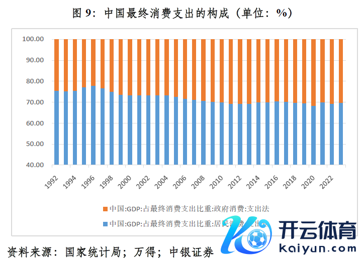 从最终浮滥支拨的组成看,与前两次海外金融危险比较,政府浮滥(各人浮滥)的逆周期改换作用有待进一步阐扬。2020~2023年,最终浮滥支拨中,政府浮滥算术平均占比30.6%,较2015~2019年均值仅上升0.6个百分点。而1998~2002年,该项占比较1993~1997年均值上升2.73个百分点;2009~2013年,该项占比较2004~2008年均值上升2.24个百分点(见图9)。由此可见,前两次海外金融危险时代,中国引申积极的财政战略,不仅扩大政府投资,还刺激最终浮滥。其时,中国取舍了提高公事职工资、饱读舞家电下乡等战略举措。