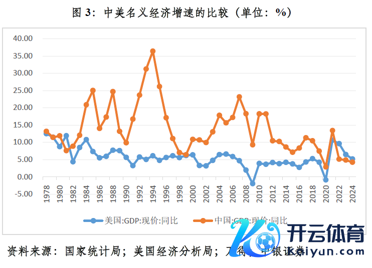 正因为中国经济尚处于负产出缺口,故引申愈加积极有为的宏不雅战略,加强逆周期改换,当属击中要害。若是中国经济连接回升,推动践诺增速回到潜在增速以上,由负产出缺口转为正产出缺口,则中国经济还将保持追逐态势。事实上,跟着中好意思经济产出缺口的相向不断,2022~2024年间,好意思国格局GDP增速当先中国的上风依然过4.67个百分点降至1.06个百分点(见图3)。